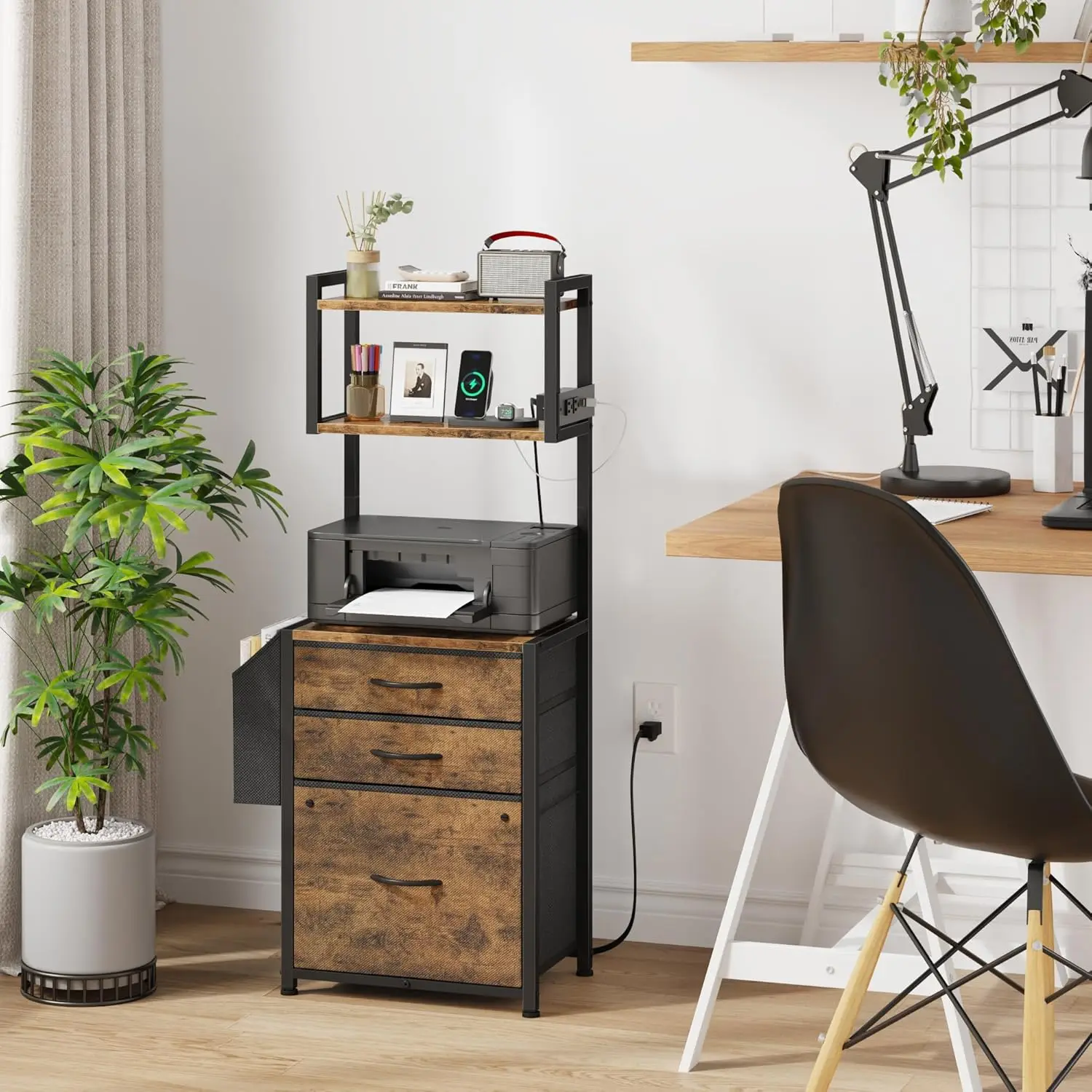 Upgrade your workspace with this 45-inch 3-drawer file cabinet.Designed with a built-in charging station for added convenience.Three spacious drawers provide ample storage for files and office essentials.The top surface works perfectly as a printer stand or workspace.Rustic brown finish adds warmth and style to your office décor.Durable construction ensures long-lasting performance and stability.Ideal for home offices, study rooms, or workspaces.Helps keep your documents organized and within easy reach.Compact yet functional design fits well in various room layouts.Enhance productivity and organization with this versatile office storage cabinet.