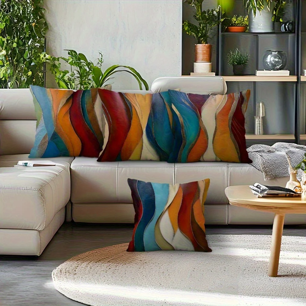 Add a splash of color and modern style to your space with this 4-piece wave-themed pillow cover set. Features vibrant abstract wave patterns for a trendy and artistic look. Made from soft short plush fabric for a cozy and comfortable feel. Single-sided printing with a clean and simple backing design. Perfect for sofas, beds, chairs, or decorative arrangements. Great for living rooms, bedrooms, or lounge areas. Hidden zipper closure allows easy insertion and removal (pillow cores not included). Durable and easy-care material ensures long-lasting use. Mix and match with other décor to create a lively and stylish atmosphere. Refresh your home décor effortlessly with these colorful plush cushion covers.
