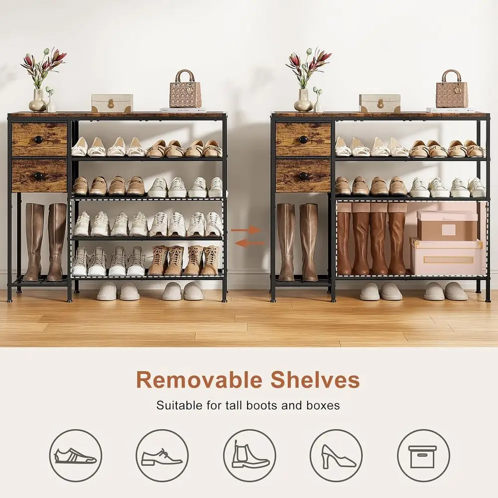 Keep your footwear neatly organized with this 5-tier shoe storage rack. Designed with metal frames, wooden boards, and two fabric covers for versatile storage. Holds 16–20 pairs of shoes, including boots, sneakers, and flats. The multi-tier design maximizes vertical space while keeping shoes accessible. Fabric covers help protect shoes from dust while adding a neat look. Perfect for bedrooms, closets, entryways, or mudrooms. Durable construction ensures long-lasting support for everyday use. Easy to assemble and rearrange to fit your space and needs. Ideal for keeping your home clutter-free and your shoes organized. Combine functionality and style with this practical and sturdy shoe organizer.