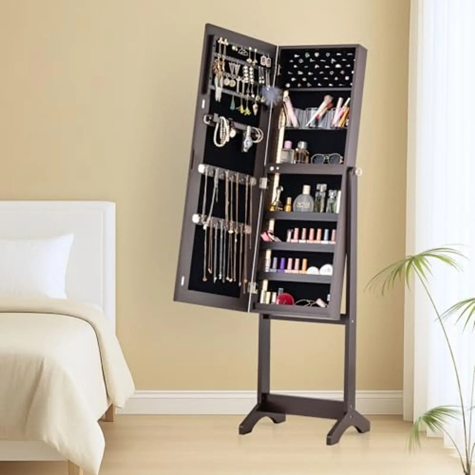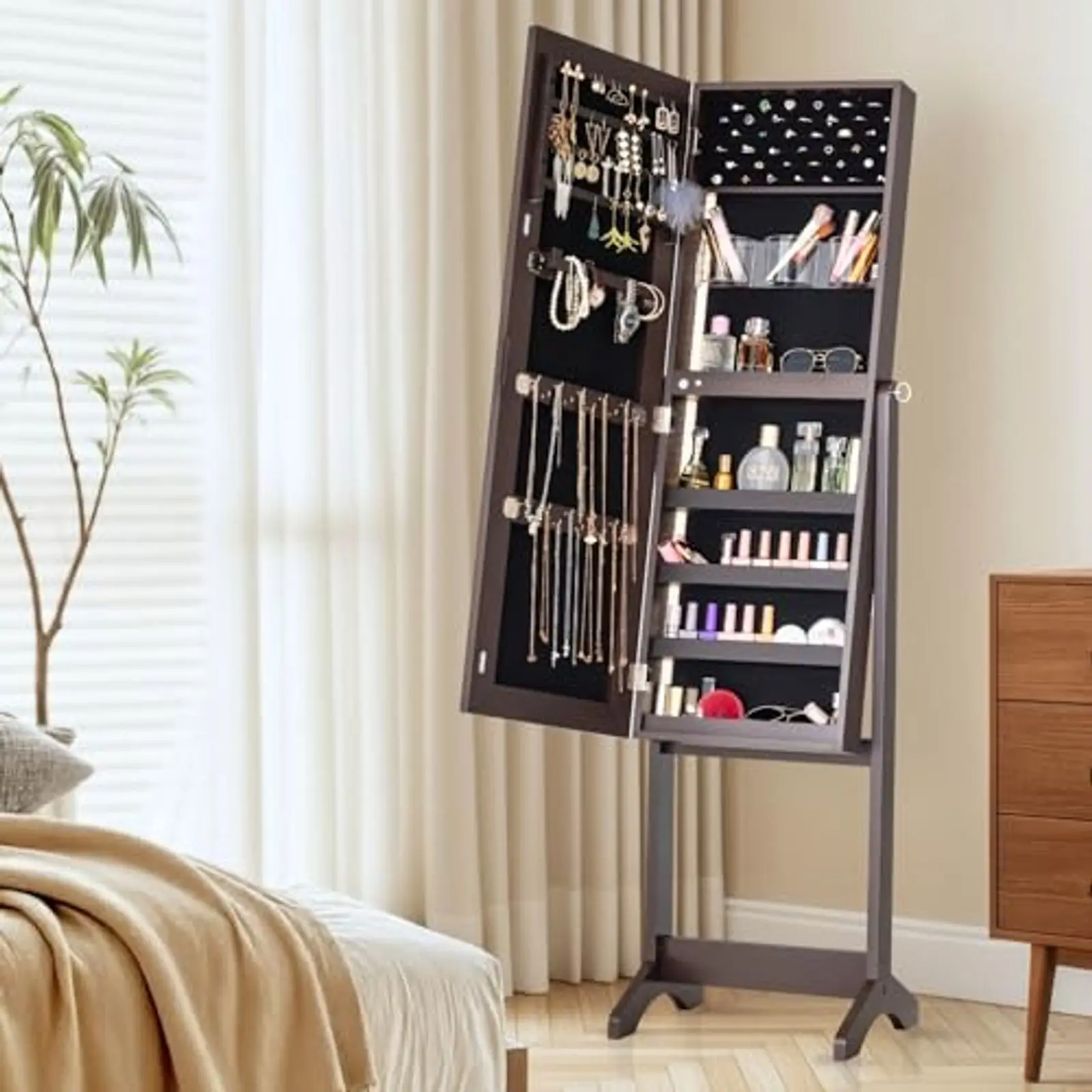 Organize and protect your accessories with this free standing jewelry armoire cabinet. Features a frameless full-length mirror for convenient dressing and styling. Large interior storage is designed to keep jewelry neatly organized and tangle-free. Multiple compartments and hooks help store rings, earrings, necklaces, and bracelets. Elegant brown finish adds a warm and classic touch to your bedroom décor. Sturdy freestanding design provides stability and easy placement anywhere. Soft interior lining helps protect jewelry from scratches and damage. Space-saving design combines mirror and storage in one functional piece. Perfect for bedrooms, closets, or dressing areas. Enjoy style, convenience, and organization with this all-in-one jewelry storage solution.