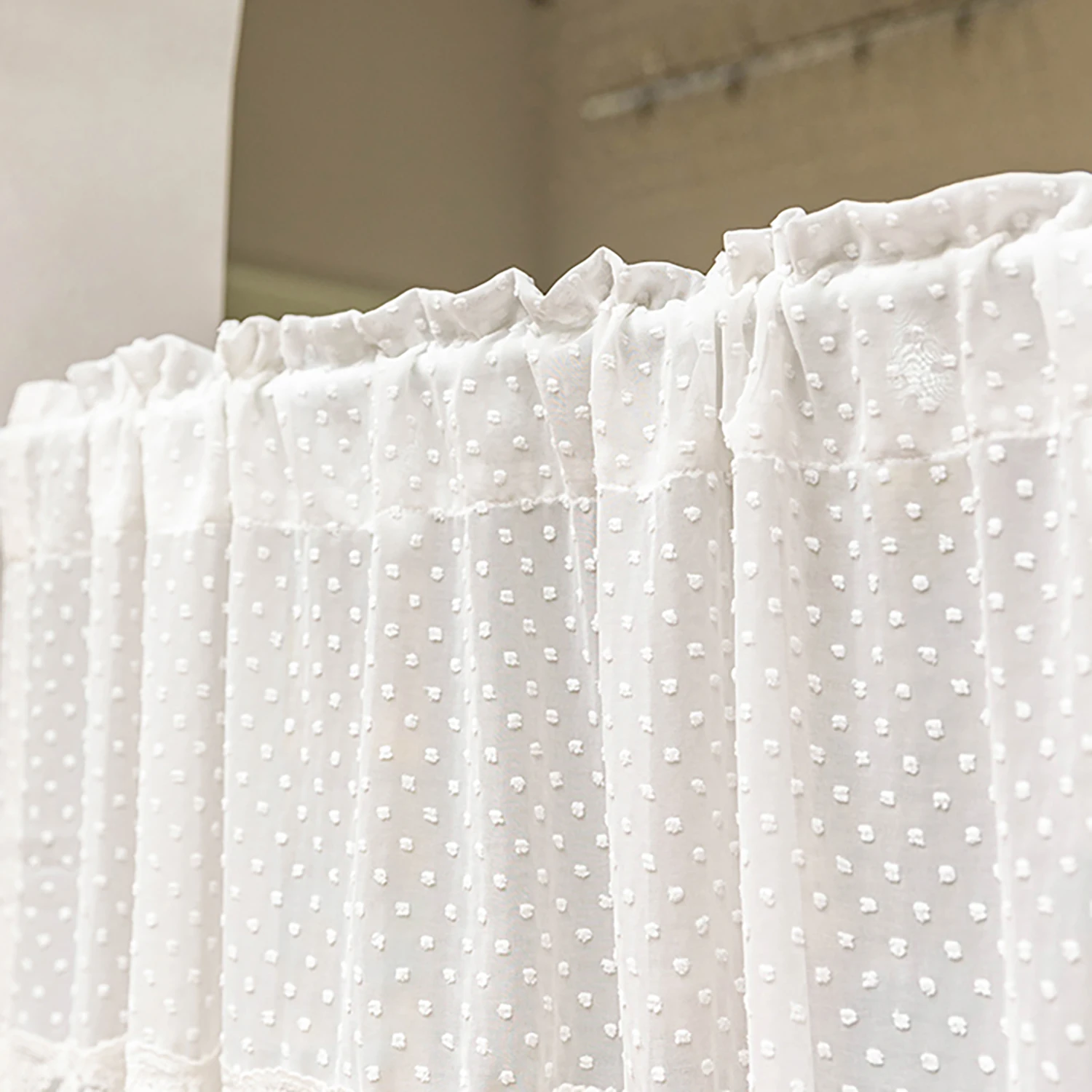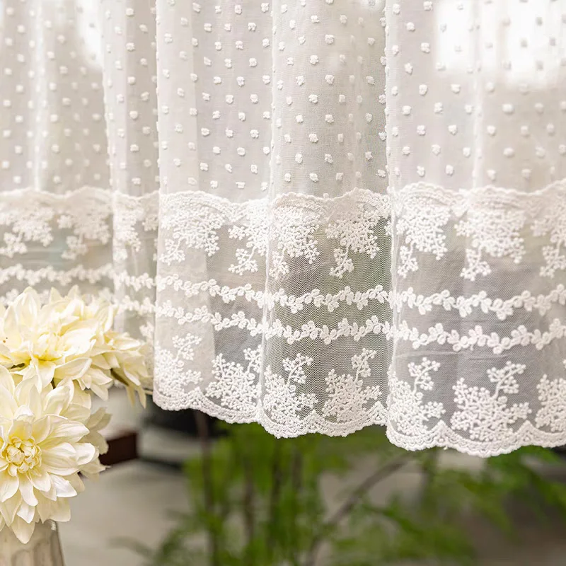 Add a touch of charm to your kitchen or small windows with this Korean-style polka dot valance. Made from soft tulle with stitched lace, it offers a delicate and airy look. The short length makes it perfect for small windows or as a decorative topper. Polka dot design adds a playful yet elegant farmhouse vibe. Sheer voile fabric allows natural light to gently filter through while maintaining privacy. Ideal for kitchens, breakfast nooks, or cozy spaces in your home. Vintage-inspired lace stitching enhances the decorative appeal. Lightweight and easy to hang on most standard curtain rods. Easy to maintain and machine washable for everyday convenience. Elevate your window décor with this stylish and charming lace valance.