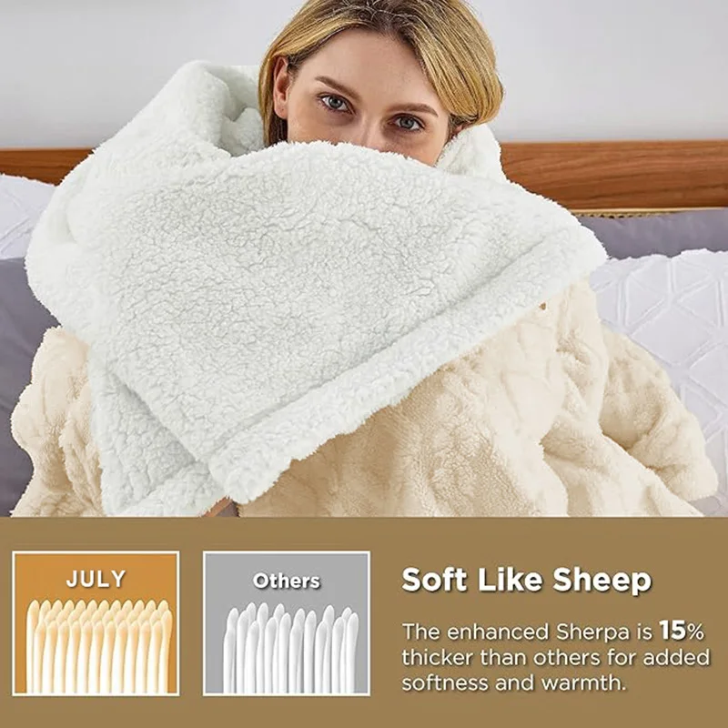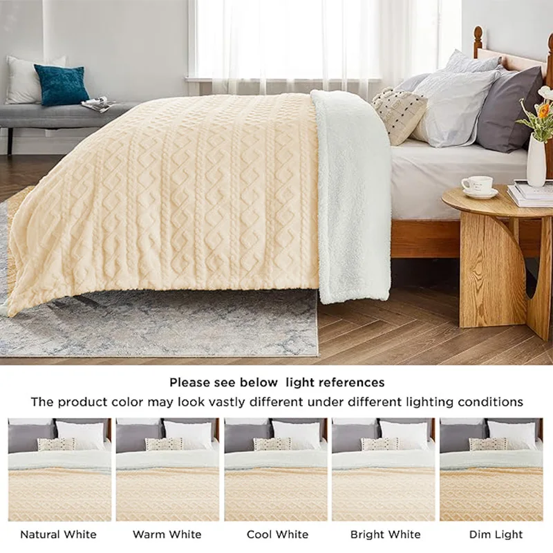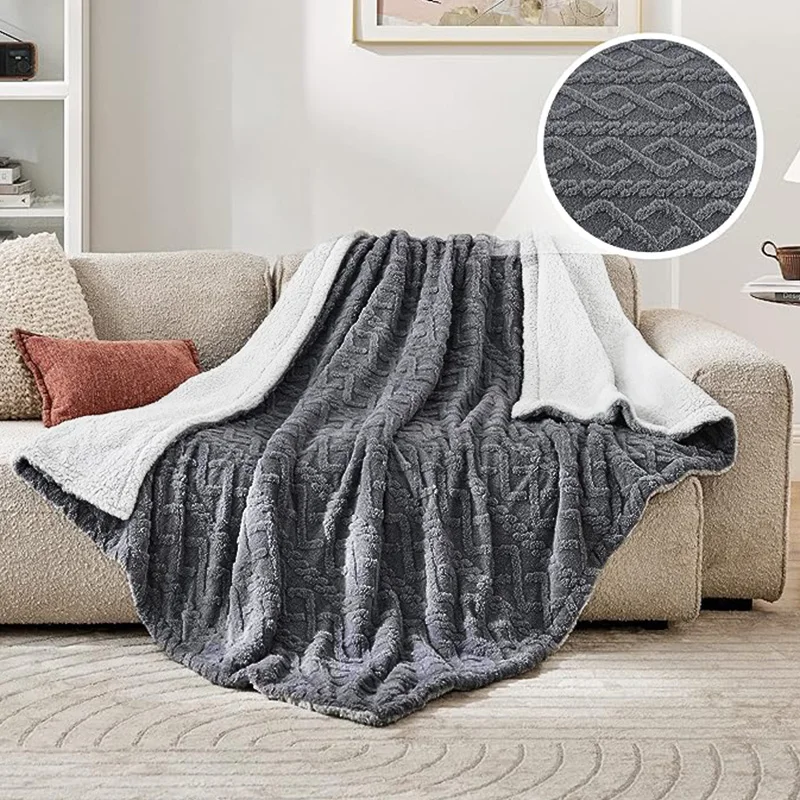 Wrap yourself in warmth with this soft Sherpa fleece cable jacquard throw blanket. Thick 500GSM fabric provides extra warmth and plush comfort. Dual-texture design combines smooth fleece with cozy Sherpa backing. Elegant cable jacquard pattern adds a classic and stylish touch. Perfect for couches, beds, or lounging in any room. Available in 4 colors to match your home décor. Ideal for all-season use, especially during cooler days and nights. Durable and easy-care material ensures long-lasting softness. Great for movie nights, relaxing, or as a thoughtful gift. Enjoy comfort, warmth, and style with this luxurious Sherpa throw blanket.Â