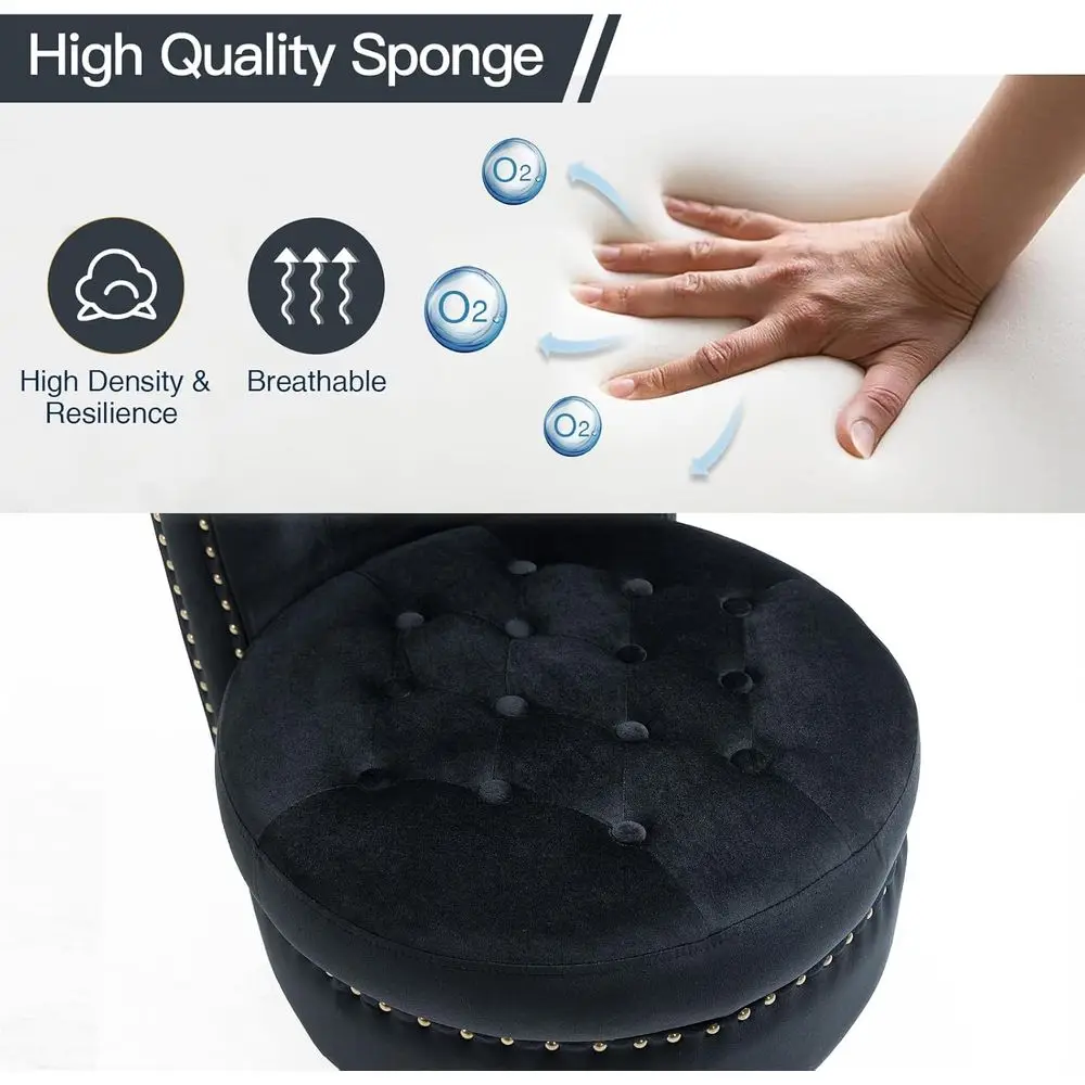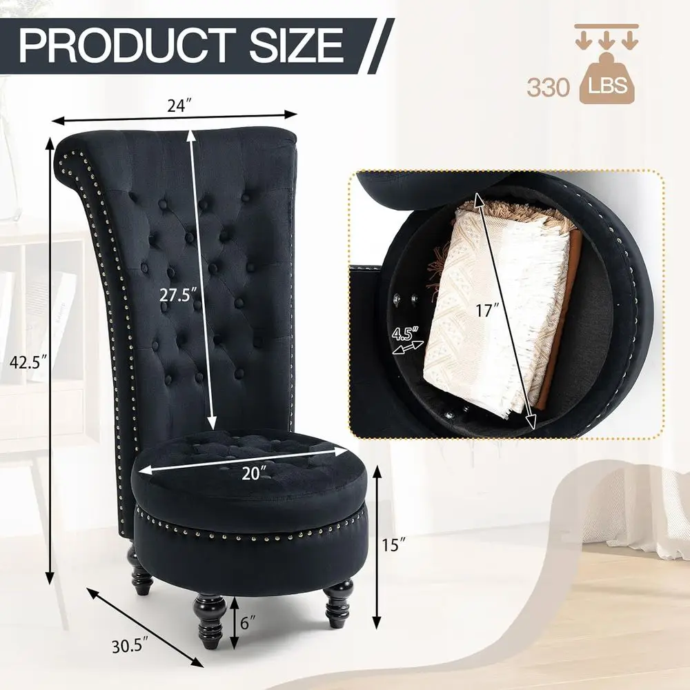 Make a bold statement with this velvet high-back throne chair. Designed with an elegant tall backrest for a regal and eye-catching look. Soft black velvet upholstery adds luxury and comfort to your space. Features built-in storage to keep small items neatly tucked away. Nail-trim detailing enhances the classic and sophisticated design. Perfect for living rooms, bedrooms, dressing areas, or statement corners. Sturdy construction ensures durability and long-lasting use. Comfortable padded seat and backrest for relaxing or lounging. Blends classic elegance with modern functionality. Elevate your décor with this stylish and functional throne accent chair.Â